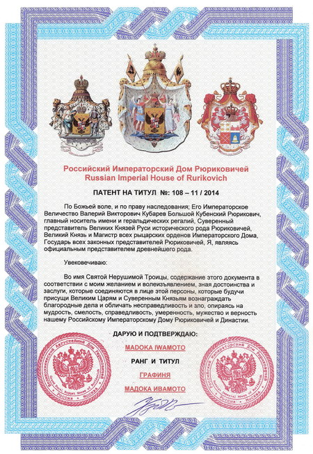 Titles Viscountess and Countess of Russian Imperial House of Rurikovich to Lady Anna Maria Spalvieri and Lady Madoka Iwamoto accordingly are granted. Countess Madoka Iwamoto is appointed by the Plenipotentiary Ambassador of Holy Russia to Japan. With the purpose of development of idea of monarchic statehood of Russia, in the name of the peace and prosperities of Russia, in the name of restoration of historical validity and in the name of strengthening the international friendship by the Highest Decrees are granted Titles Viscountess and Countess of Russian Imperial House of Rurikovich to Lady Anna Maria Spalvieri and Lady Madoka Iwamoto accordingly. Lady Madoka Iwamoto belongs to the clans, being lineal descendants of Emperor Seiwa (IX century) through families Takeda and Minamoto (XI-XII centuries). Countess Madoka Iwamoto is appointed by the Plenipotentiary Ambassador of Holy Russia to Japan with the purpose of an establishment of diplomatic and friendly attitudes between Japan and Holy Russia. Holy Russia, Russian Imperial House of Rurikovich and Fund of Princes intimately congratulate Viscountess Anna Maria Spalvieri and Countess Madoka Iwamoto on granted Titles of Russian Imperial House of Rurikovich and the introduction into Fund of Princes. We wish new members of Russian Imperial House of Rurikovich and the new Plenipotentiary Ambassador of Holy Russia of all successes in work and private life. The God bless all Ladies of Russian Imperial House of Rurikovich!
