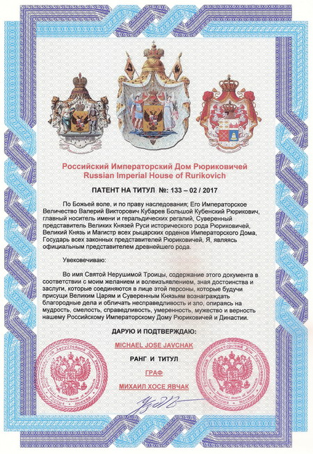 Title of Count of Russian Imperial House of Rurikovich to Metropolitan of New York and All-America of Ukrainian Autocephalous Orthodox Church the Most Rev. Michael Javchak and Title Baroness to Natalia Trushechkina are granted. Count Vladyka Michael Javchak is appointed by Metropolitan of New York and USA of Nova Church of Holy Russia. With the purpose of development of idea of monarchic statehood of Russia, in the name of the peace and prosperities of Russia, in the name of restoration of historical validity and in the name of strengthening the international friendship, and also in the name of clarification of Orthodoxy from heresy and obscurantism by the Highest Decree grants the Title Count of Russian Imperial House of Rurikovich to Metropolitan of New York and All-America of Ukrainian Autocephalous Orthodox Church the Most Rev. Michael Jose Javchak. The Highest Decree the Most Rev. Count Vladyka Michael Jose Javchak is appointed by Metropolitan of New York and USA of Nova Church of Holy Russia. Also by the Highest Decree grants the Title Baroness of the Russian Imperial House of Rurikovich to Natalia Trushechkina. Holy Russia, Russian Imperial House of Rurikovich and Fund of Princes intimately congratulate the Count Metropolitan Michael Javchak and Baroness Natalia Trushechkina on grants of Titles of Russian Imperial House of Rurikovich and the introduction into Fund of Princes. We wish new members of Russian Imperial House of Rurikovich and Nova Church of Holy Russia all successes in work and private life. God bless all Knights and Ladies of Russian Imperial House of Rurikovich!