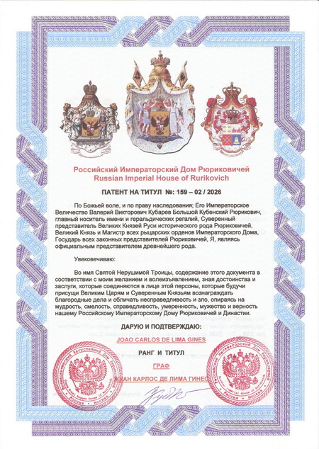 Grand Prince Prof. Dr. Valeriy Viktorovich Kubarev granted the Title Count of the Russian Imperial House of Rurikovich to Mr. Joao Carlos de Lima Gines. Grand Prince Prof. Dr. Valeriy Viktorovich Kubarev, Holy Russia, the Russian Imperial House of Rurikovich and the Fund of Princes advocate for the preservation of the noble and aristocratic traditions of the peoples of the whole world, including citizens of Russia, Brazil and Spain. In order to develop the idea of monarchical statehood of Russia, in the name of peace and prosperity of Russia, in the name of restoring historical justice and in the name of strengthening international friendship, the Supreme Decree granted the Title Count of the Russian Imperial House of Rurikovich to Mr. Joao Carlos de Lima Gines. Holy Russia, the Russian Imperial House of Rurikovich and the Fund of Princes cordially congratulate Count Joao Carlos de Lima Gines on the conferment of the Title of the Russian Imperial House of Rurikovich. We wish all members of the Russian Imperial House of Rurikovich and the Fund of Princes every success in their work and personal lives. God bless all the nobles of the Russian Imperial House of Rurikovich!