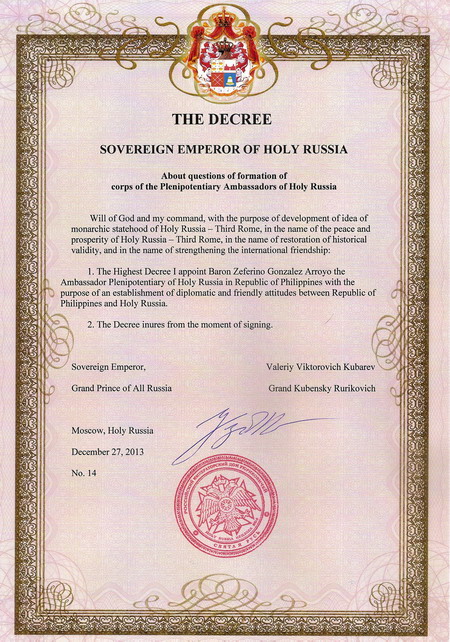 Baron Zeferino Gonzalez Arroyo appointed the Plenipotentiary Ambassador of Holy Russia in Republic of Philippines. The Highest Decree the Baron Zeferino Gonzalez Arroyo appointed the Plenipotentiary Ambassador of Holy Russia in Republic of Philippines with purpose of an establishment of diplomatic and friendly attitudes between Republic of Philippines and Holy Russia. Sovereign Emperor of Holy Russia Grand Prince Valeriy Viktorovich Kubarev with all his heart congratulates the new Plenipotentiary Ambassador of Holy Russia on purpose and wishes successes on new field, realization of the conceived and prompt official recognition of Holy Russia – Third Rome all states of the world. God bless all Roman citizens and Ambassadors of peace and friendship of Holy Russia.