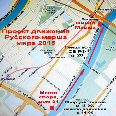 https://www.facebook.com/EuRussia или отправляйте личные сообщения администраторам группы. Нам потребуются активисты, кто будет помогать нести баннеры и флаги. Атрибутика готова. Приветствуются люди с креативными плакатами и идеями. Нужно также придумать частушки и лозунги. Место сбора участников Фрунзенская набережная, д. 54 в 13:00. Заявка на проведение Русского марша Мира будет подана 21 октября 2015 года. Координатор Великий Князь, профессор и доктор наук Валерий Викторович Кубарев Контакт: holyrussia@list.ru